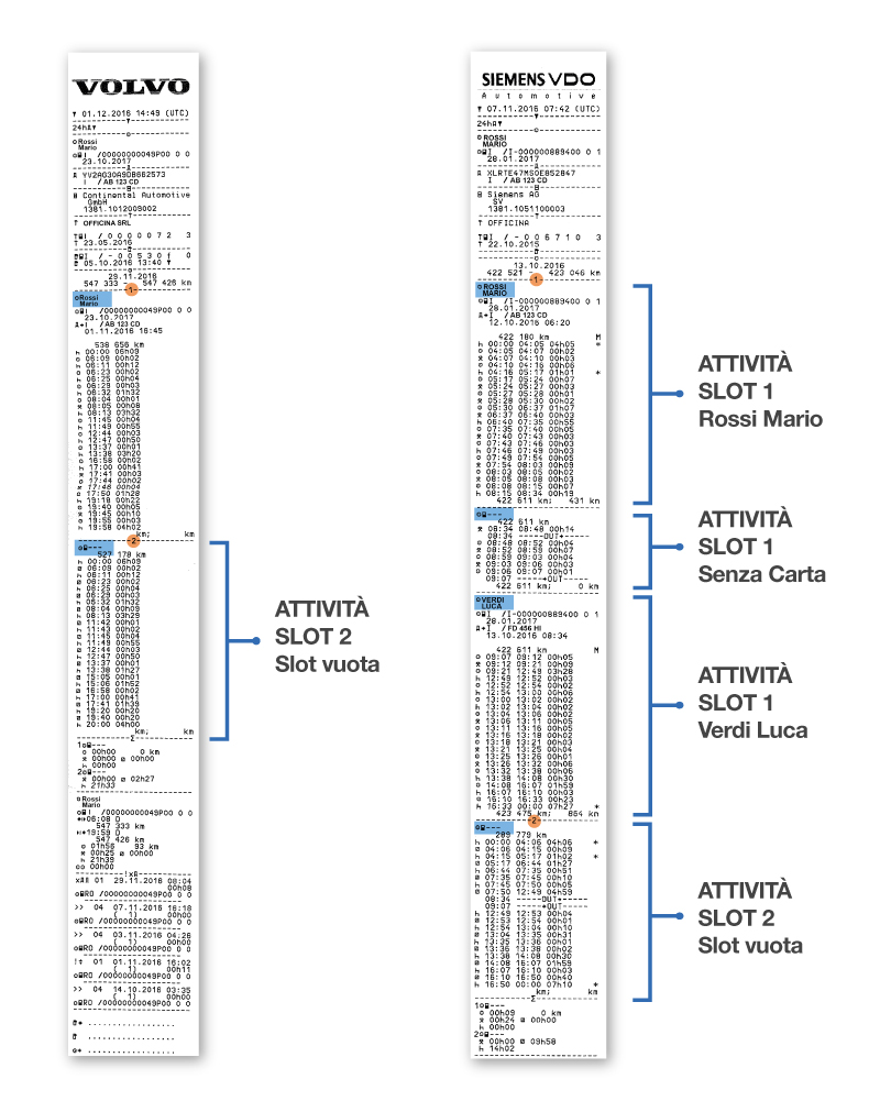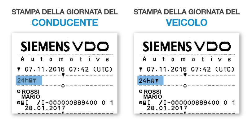 A differenza della singola stampa delle attività del conducente con la stampa giornaliera del veicolo è possibile visualizzare tutte le attività di tutti i conducenti che si sono alternati alla guida e anche le attività svolte sul veicolo senza carta tachigrafica inserita.