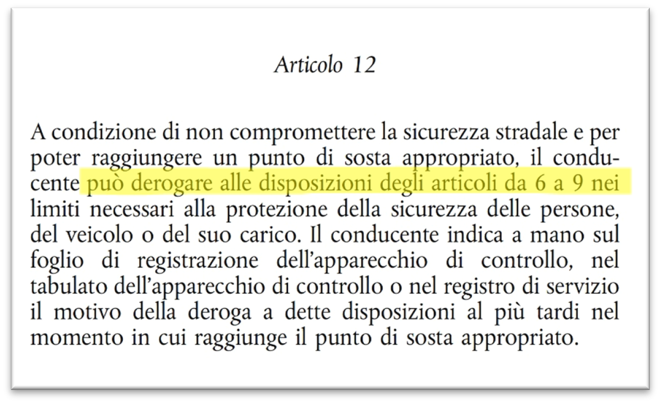 Da sempre il 561/06 ha previsto all'art.12 la possibilità di derogare ai tempi di guida e riposo (a determinate condizioni) senza rischiare di incorrere in sanzioni.