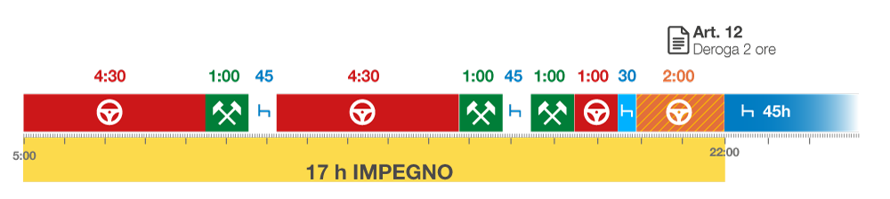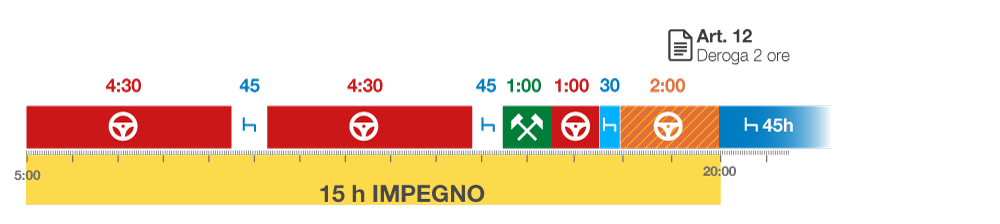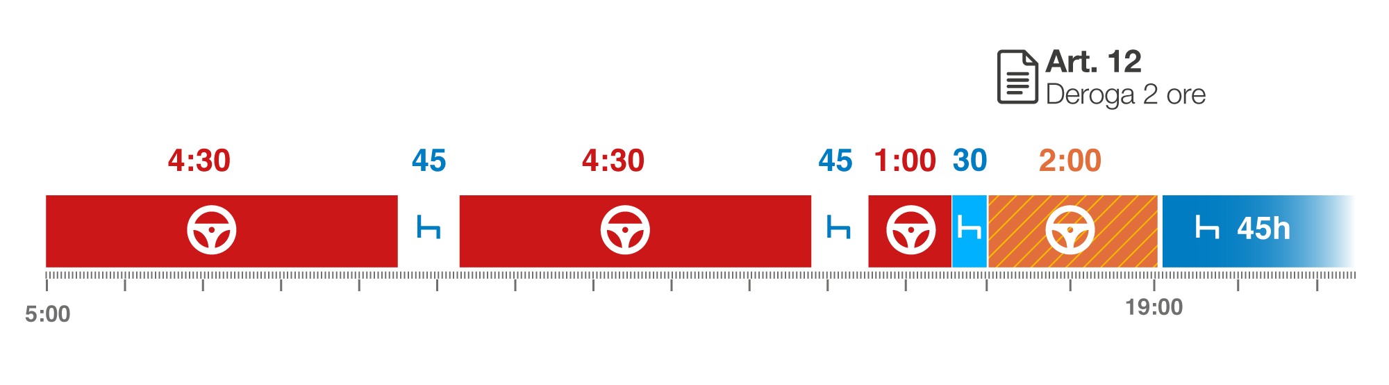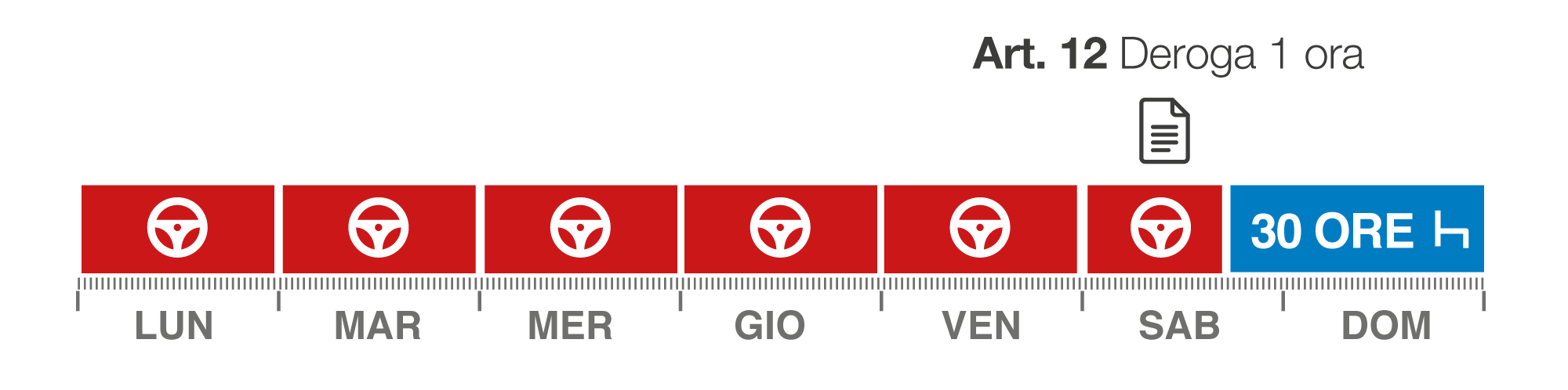 In merito alla deroga al punto 1 (quella “generica”), ad esempio, in caso di sforamento sui tempi di guida di 30 minuti, per compensare i minuti di eccesso è sufficiente partire mezzora dopo il giorno successivo (vedi esempio grafico).