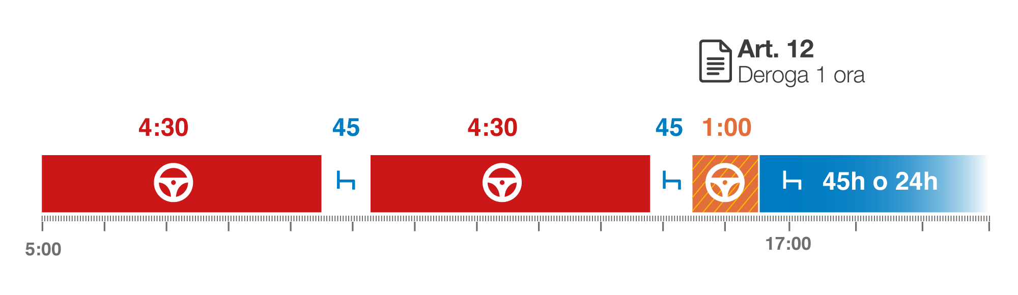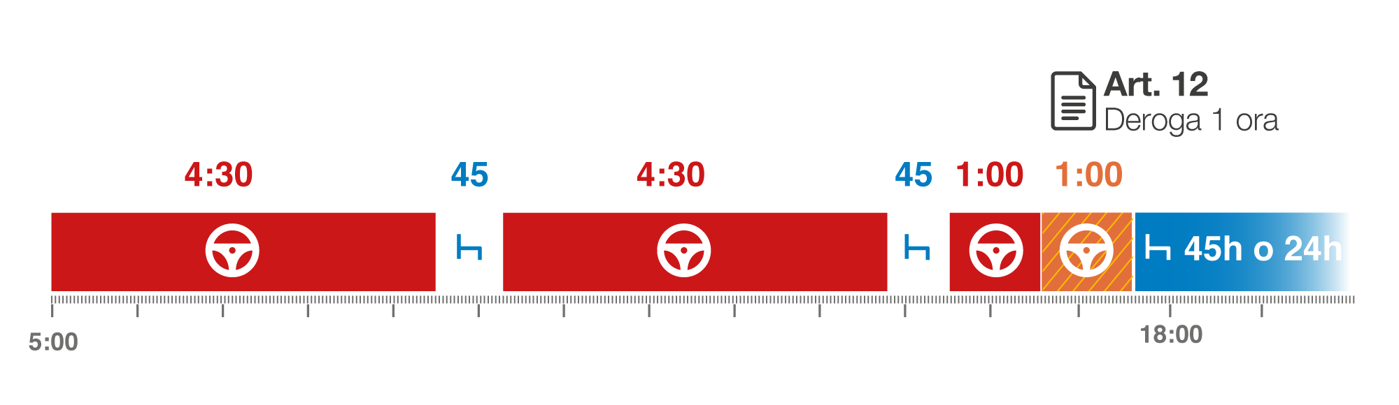 “A condizione di non compromettere la sicurezza stradale, in circostanze eccezionali, il conducente può altresì derogare alle disposizioni dell'articolo 6, paragrafi 1 e 2 (guida giornaliera e guida settimanale), e dell'articolo 8, paragrafo 2 (riposo/impegno giornaliero), superando di un'ora al massimo il periodo di guida giornaliero e settimanale al fine di raggiungere la sede di attività del datore di lavoro o il proprio luogo di residenza per effettuare un periodo di riposo settimanale”.