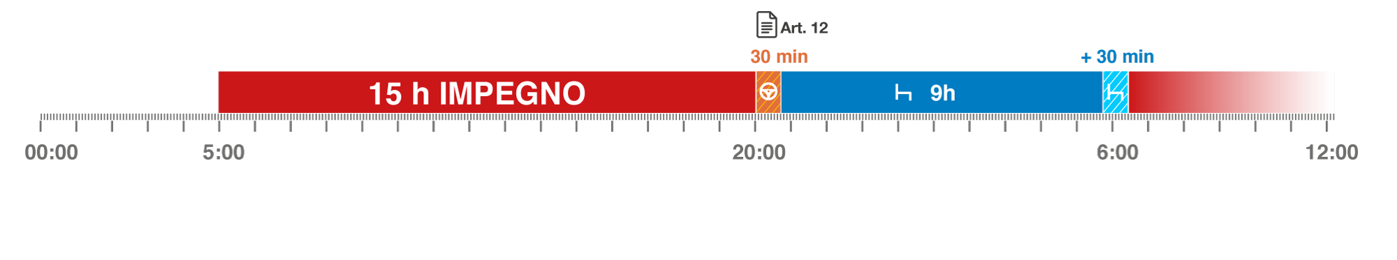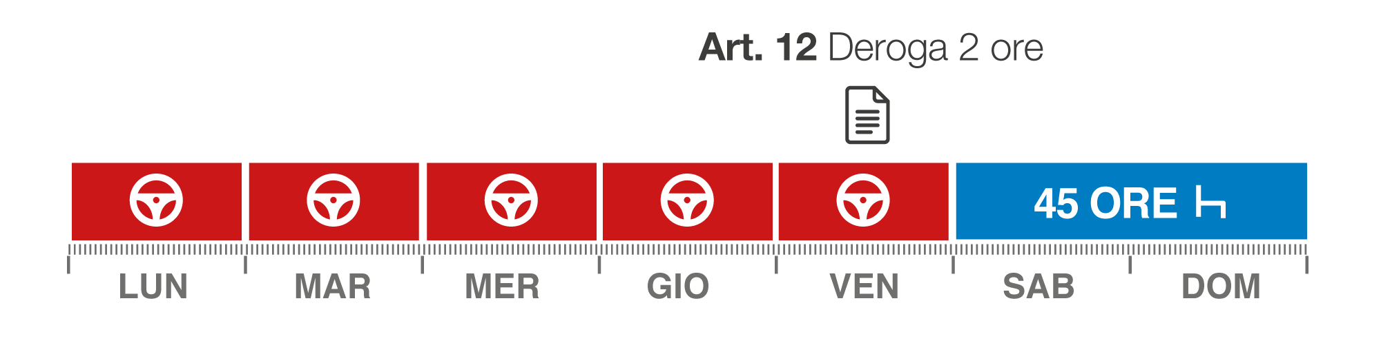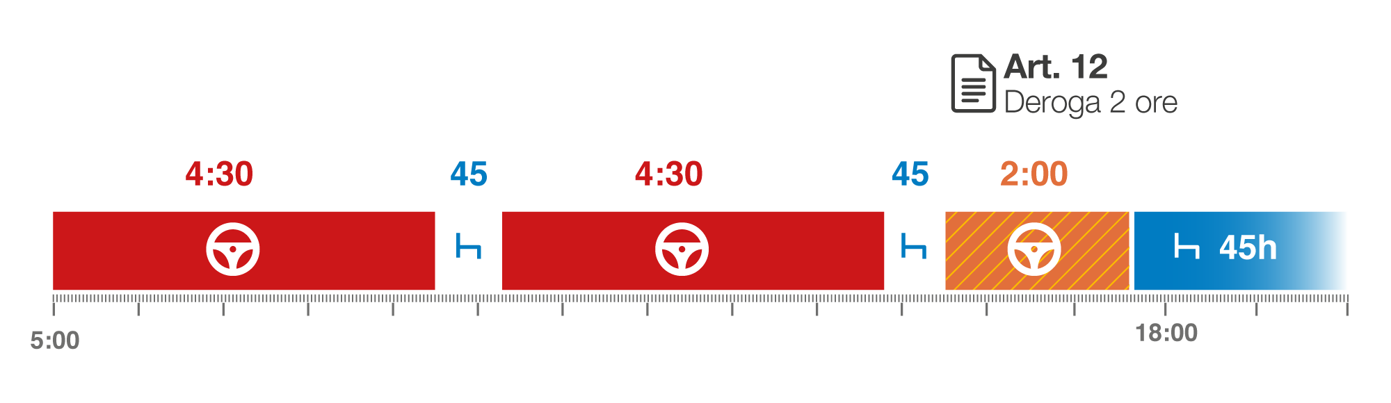 “…Alle stesse condizioni, il conducente può superare di due ore al massimo il periodo di guida giornaliero e settimanale, a condizione di aver osservato un'interruzione di 30 minuti consecutivi subito prima del periodo di guida aggiuntivo al fine di raggiungere la sede di attività del datore di lavoro o il proprio luogo di residenza per effettuare un periodo di riposo settimanale regolare”.