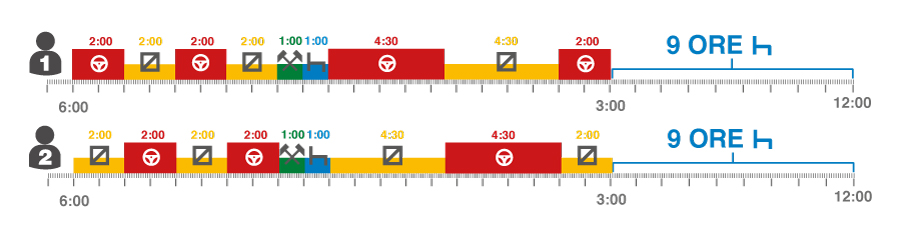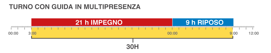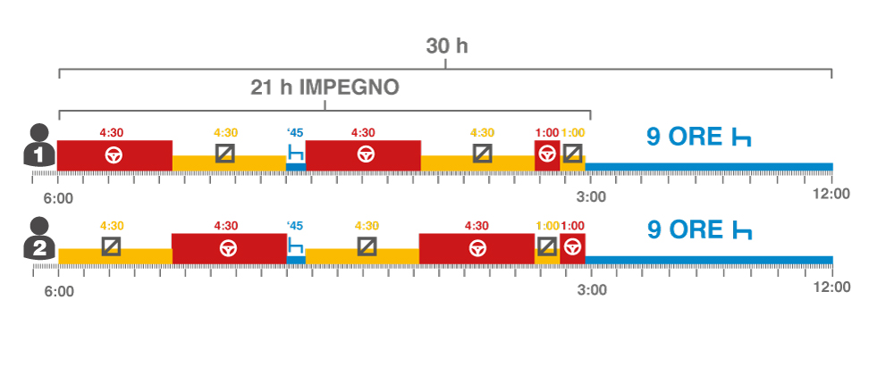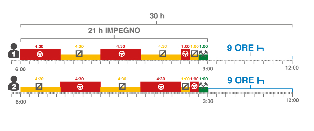 Secondo la Circolare 300/A/6262/11/111/20/03 del 22/07/2011 quando l’equipaggio è composto da più di un conducente, a ciascun conducente si chiede di completare un periodo di riposo giornaliero di almeno 9 ore entro 30 ore da quando è entrato in servizio.