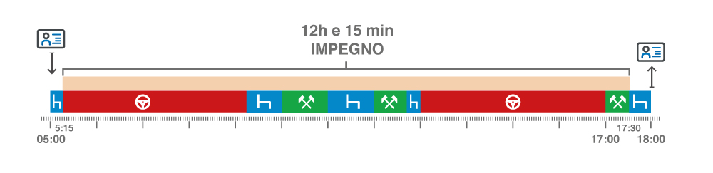 In questo esempio il tempo di impegno va calcolato dalle 5:15 fino alle 17:30 quindi dall’inizio della prima attività lavorativa (guida) fino all’ultima attività lavorativa (lavoro).