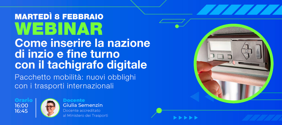 Per approfondire l’argomento vi invitiamo a seguire il webinar che si terrà martedì 8 febbraio 2022 alle ore 16:00 (possibile acquistare anche la registrazione), nel quale verranno esposte le procedure da effettuare per l’inserimento della nazione di Inizio e fine turno su i tachigrafi VDO e STONERIDGE.
