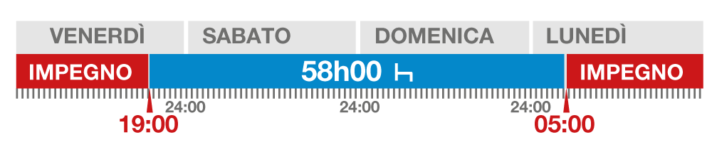 In questo caso quindi il riposo settimanale va calcolato dalle 19:00 del venerdì fino alle 5:00 del lunedì. Non può quindi essere considerato fino alle 24:00 della domenica.
