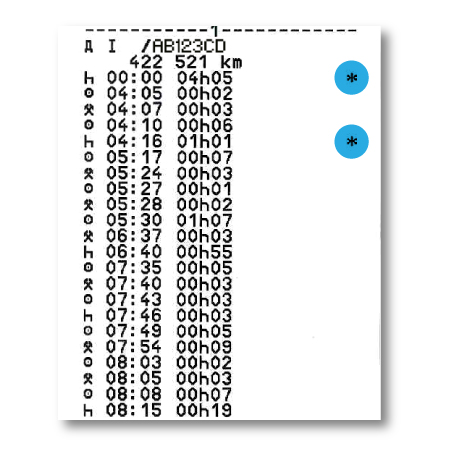 Il simbolo dell’asterisco non rappresenta niente di allarmante e non ha nessuna attinenza con le interruzioni di 45 o 15+30 minuti ma si trova semplicemente in corrispondenza di un riposo di ALMENO 1 ora. Attenzione, l’asterisco è presente solo nelle stampe realtive ai tachigrafi digitali più vecchi. (prima generazione)