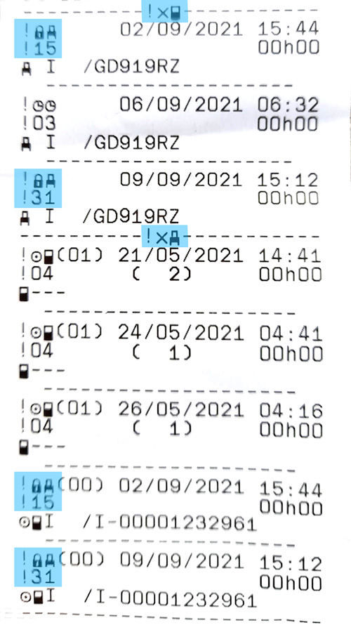 Di seguito riportiamo un esempio di stampa delle 24 ore del conducente che include entrambi gli errori.