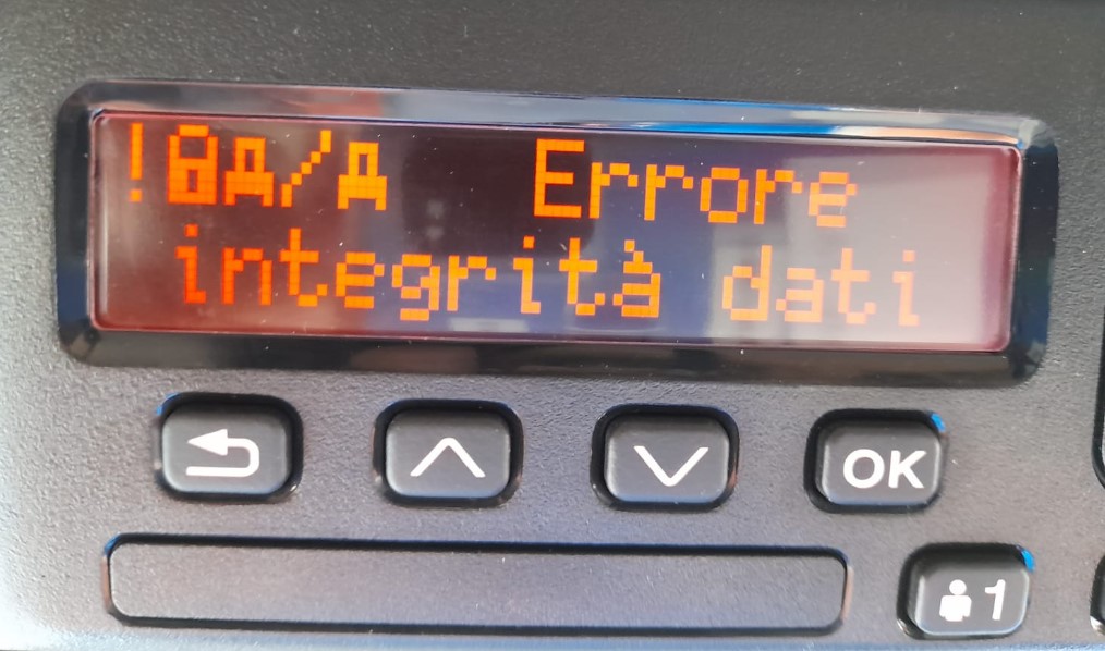 Quando compare un messaggio di questo tipo significa che è presente un errore di integrità dei dati dell’utente memorizzati nel tachigrafo. È necessario quindi effettuare una verifica presso un centro tecnico.
